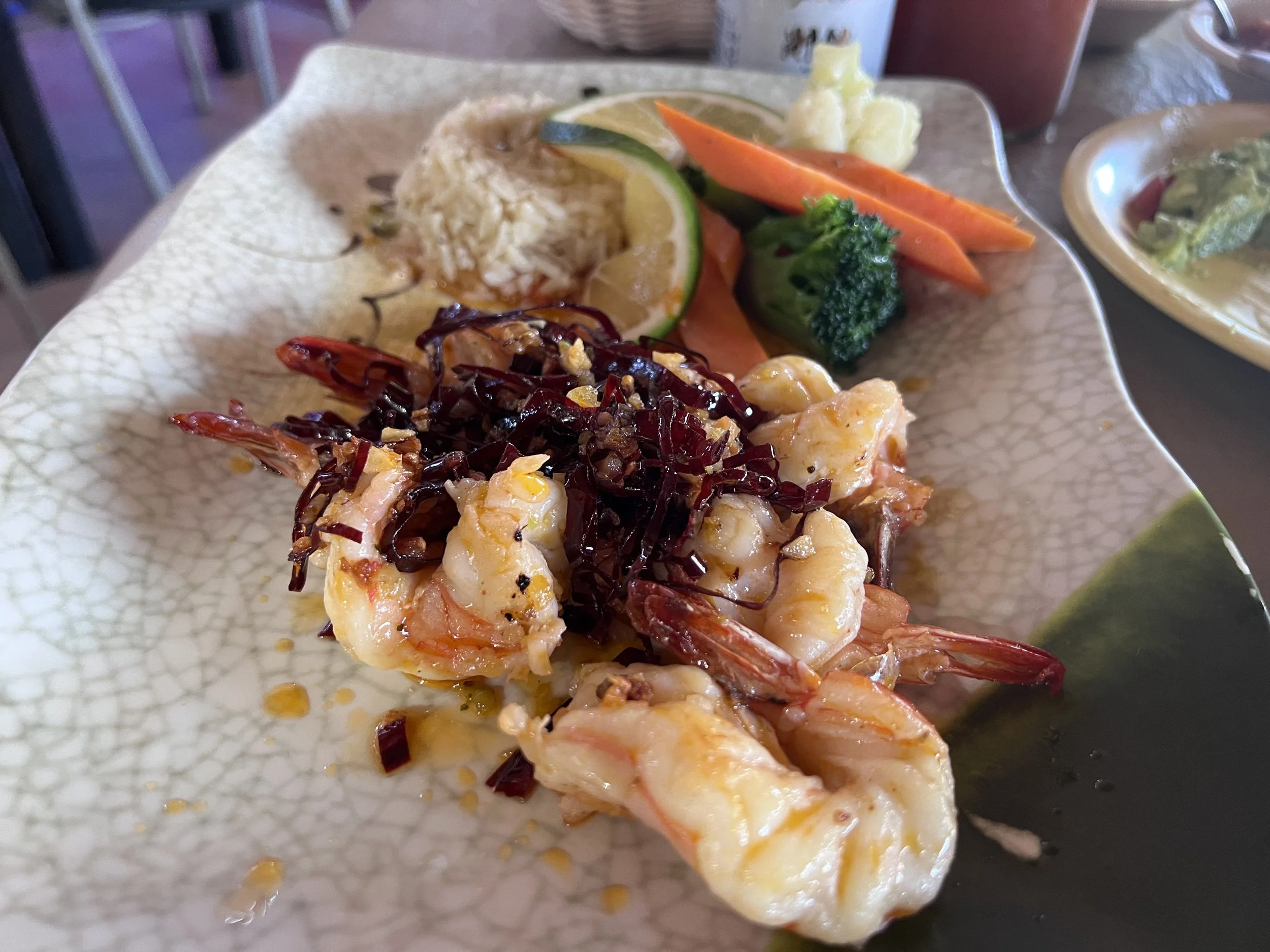 For mains we ordered the pulpo al ajillo (octopus slow-cooked with garlic, served with rice and steamed vegetables) and the camarones al ajillo (giant shrimp seared in garlic butter and topped with crispy threads of dried chile de árbol). Both were exactly what they needed to be — the octopus tender with real garlic depth, the shrimp sweet and butter-soaked with a slow burn from the chile threads that creeps up on you about three bites in.