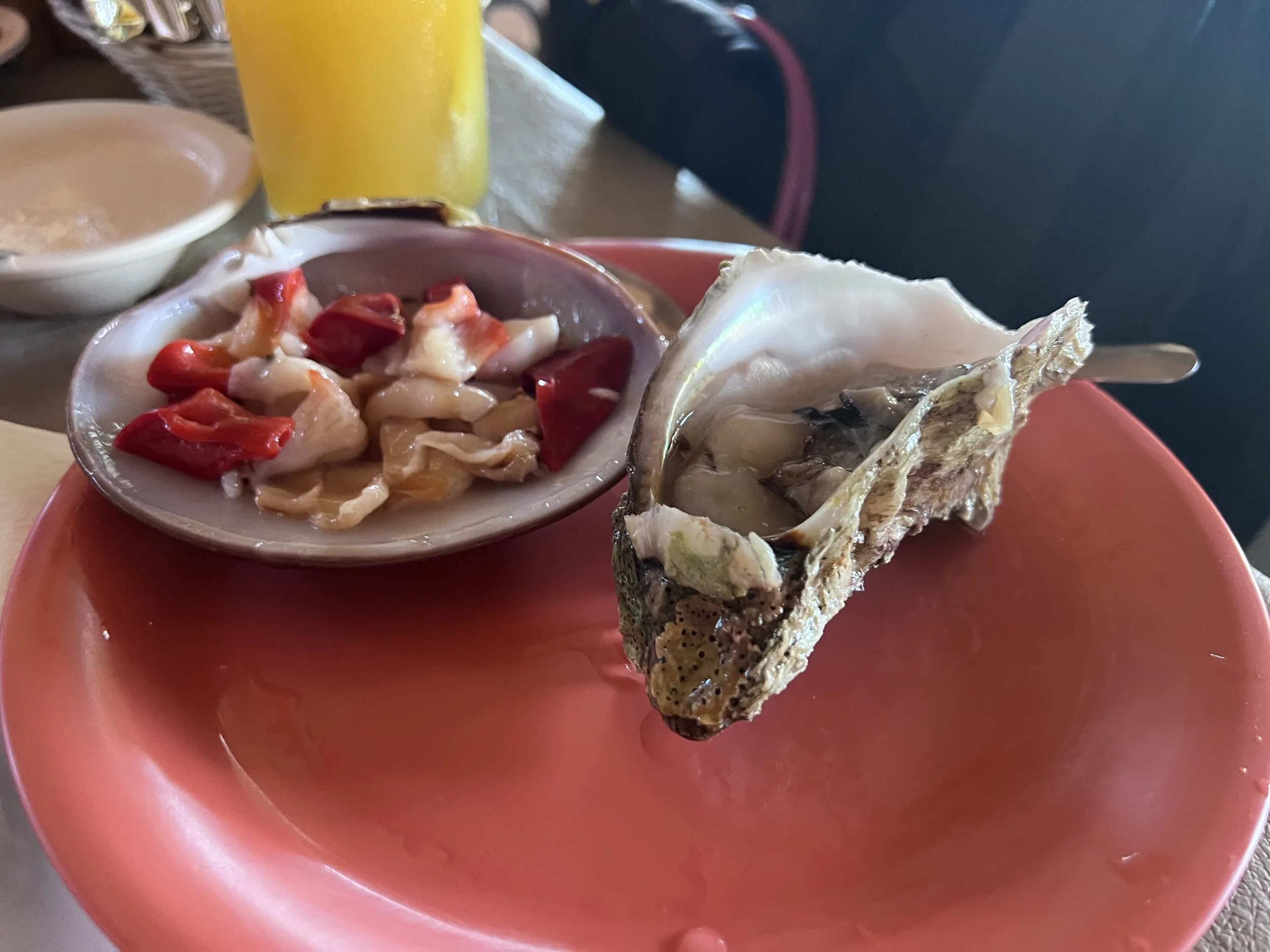 We started with a round from the raw bar: fresh Pacific oysters and a whole chocolate clam (almeja chocolata, native to the Sea of Cortez) served on the half shell with red chile, lime, and a little salt. If you haven’t had chocolate clams before, they’re one of Baja’s best raw offerings — cleaner and sweeter than most Atlantic clams, and hard to find fresh outside the peninsula.